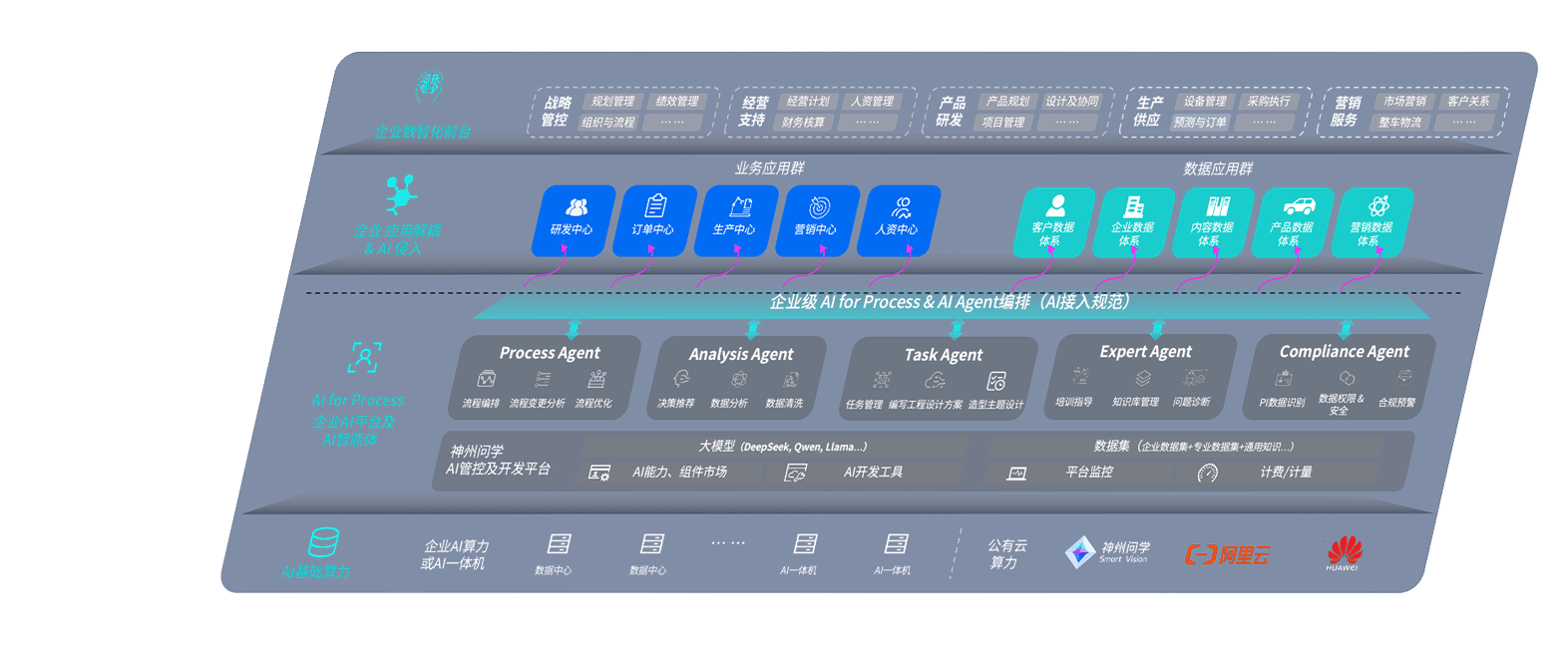 端到端的一站式AI工作空间深度融合了从企业战略规划到日常经营的全流程业务板块,,定向解决车企内部领域多、、、部门多、、、链条长、、场景碎片化等难题,,支持车企快速构建以AI为核心的生产力写作体系,,实现任务执行与AI能力的无缝集成与交互