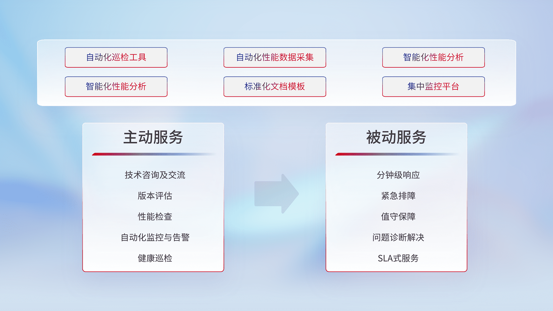 智能化工具和标准化文档,,保障服务质量,,,提供主动服务(包含技术咨询、、版本评估、、性能检查、、、自动化监控与告警、、、健康巡检)和被动服务包含(分钟级响应、、、紧急排障、、值守保障、、问题诊断解决、、、SLA服务)。。。